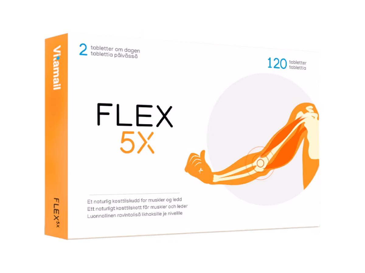 Flex5X är ett norsktillverkat kosttillskott som innehåller typ II-kollagen, boswellia serrata, gurkmeja, vitaminer och mineraler.